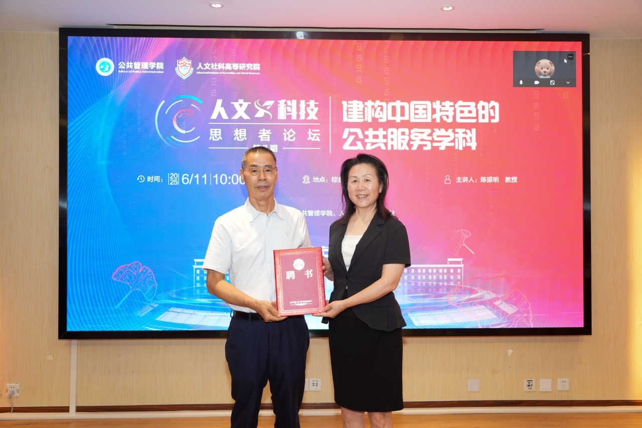 6月11日,公共管理学院与人文社科高等研究院联合主办的第七期“人文×科技”思想者论坛在清水河校区举行,厦门大学公共政策研究院院长、复旦管理学杰出贡献奖获得者陈振明教授作为本期主讲嘉宾,为我校师生带来题为“建构中国特色的公共服务学科”的学术报告。公共管理学院特聘院长丁煌教授主持论坛。申小蓉教授代表人文社科高等研究院向陈振明教授颁发了顾问委员会委员聘书。