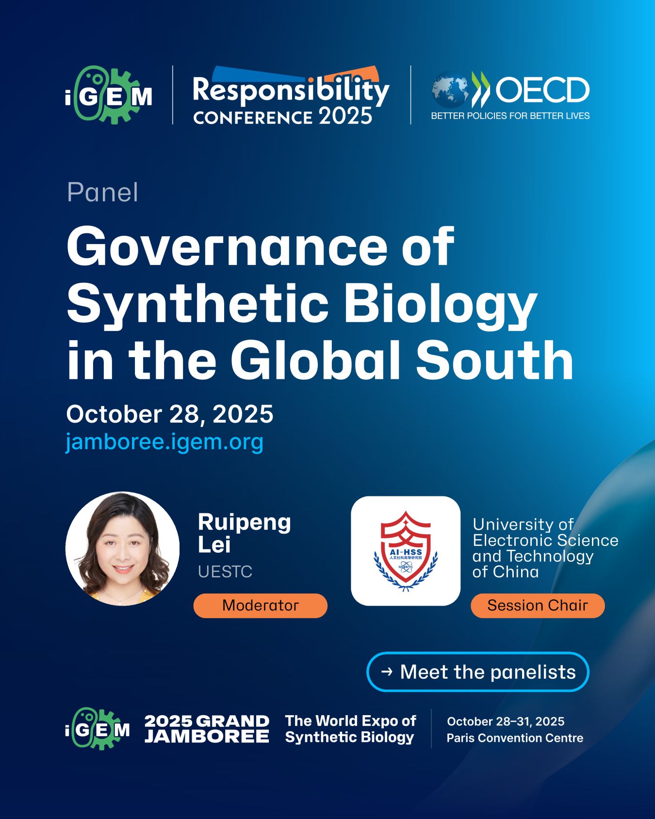 受iGEM组委会邀请,我院副院长雷瑞鹏教授作为首位在iGEM Responsibility Conference上担任session chair的中国专家参与本次会议。2025年iGEM Responsibility Conference共分为六场专题会议,雷瑞鹏教授作为其中“全球南方视角下的合成生物学治理”(Governance of Synthetic Biology in the Global South)专题会议的session chair,围绕“全球治理协作”“伦理规范与负责任实践”等关键议题进行研讨。本次会议以全球南方视角为中心,挑战现行治理范式,并把“全球共济”(Global Solidarity)作为包容性合成生物学治理的规范性原则与实践框架加以探讨。本次会议检视了当前治理结构如何在无意中排斥或边缘化全球南方声音,并探索实现更公平参与、共同塑造技术未来的路径。