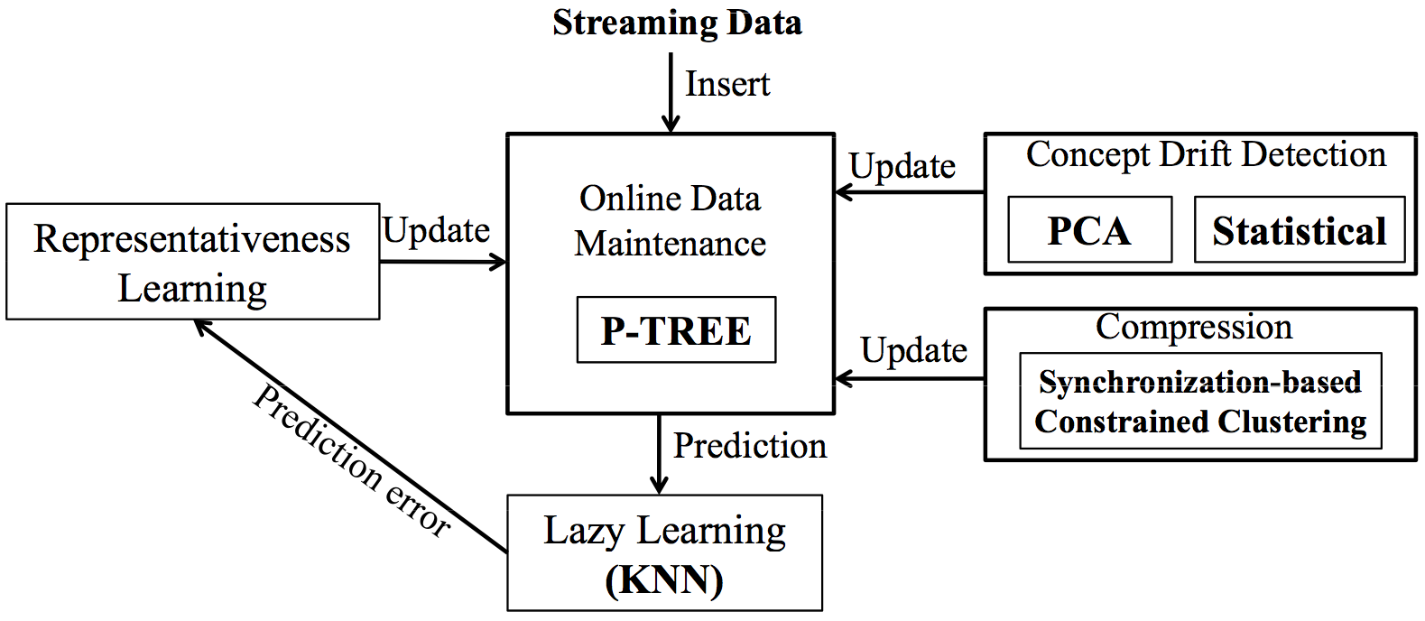ABSTRACT: In this paper, we propose a prototype-based classification model for evolving data streams, called SyncStream, which allows dynamically modeling time-changing concepts, making predictions in a local fashion. Instead of learning a single model on a fixed or adaptive sliding window of historical data or ensemble learning a set of weighted base classifiers, SyncStream captures evolving concepts by dynamically maintaining a set of prototypes in a proposed P-Tree, which are obtained based on the error-driven representativeness learning and synchronization-inspired constrained clustering. To identify abrupt concept drifts in data streams, PCA and statistical analysis based heuristic approaches have been introduced. To further learn the associations among distributed data streams, the extended P-Tree structure and KNN-style strategy are introduced.