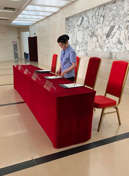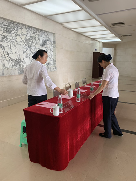 本次竞赛的内容包括主席台桌搭建、布置、摆台、茶水服务及仪态考评。比赛中,参赛员工严格按照各服务项目要求,从服务前的仪容仪表展示,到会议物品准备,再到会议摆台和茶水服务,认真应战,仔细操作。