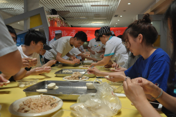 四年中,食堂举办的各种烹饪教学活动也为同学们的校园生活增上几笔彩色。通过教学活动,同学们学会了诸如回锅肉、麻婆豆腐、粽子、包子、饺子食物的烹饪制作,还观看过面塑、吹糖人、花式调酒等饮食表演,了解了饮食文化,学会了生活技能。而今,最后一次向师傅们学习烹饪,众人围坐在一起,在师傅的指导下包饺子,一个个饺子在同学们手里熟练成型,每个人脸上都洋溢着劳动的满足,和着欢声笑语,记录下这温情一刻。