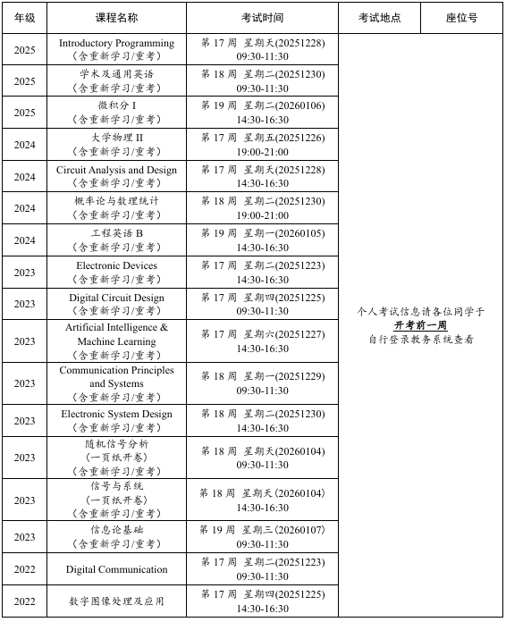 6.学院非JEI课程期末及重新学习考试安排请关注学校教务处网站通知(https://www.jwc.uestc.edu.cn/)或自行登录教务系统查看。