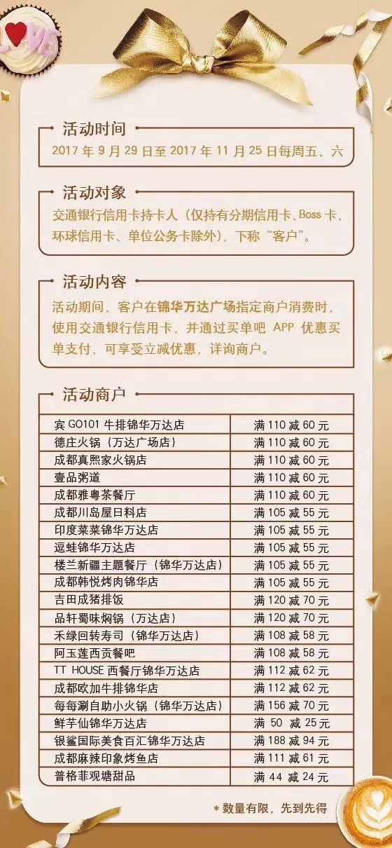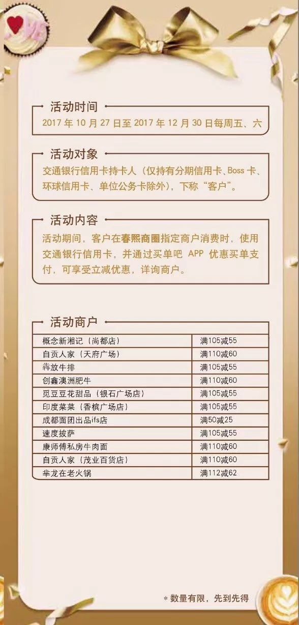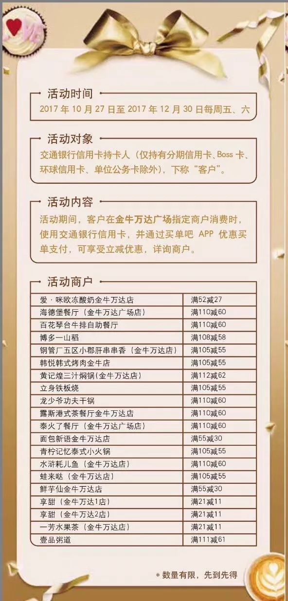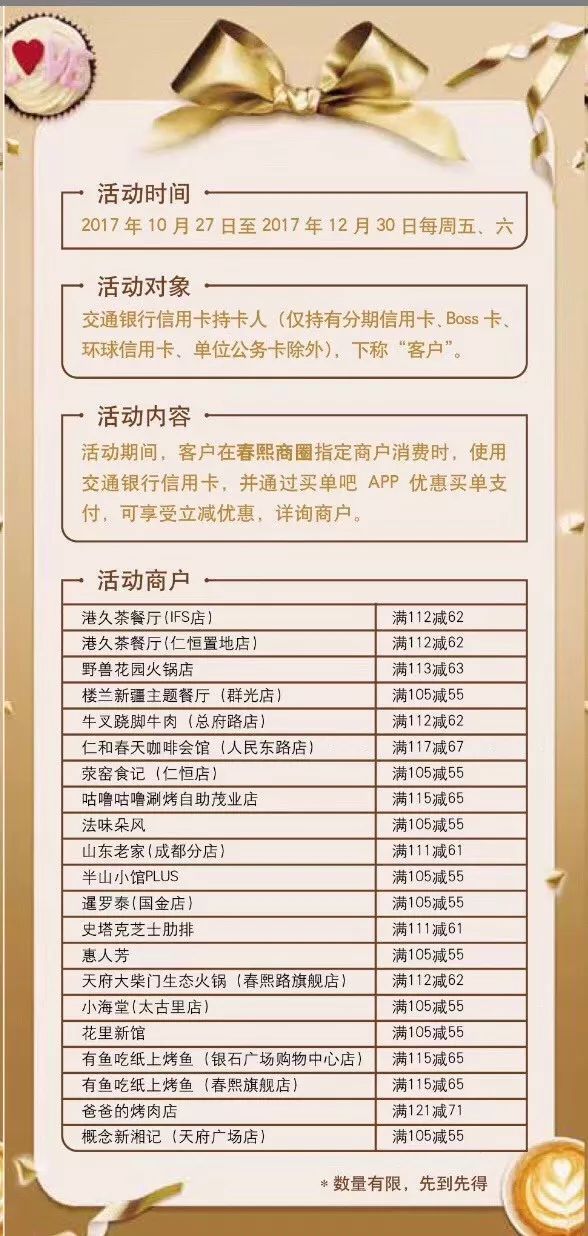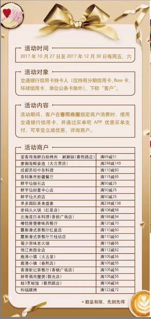 【参与门店】:详情可点击交通银行买单吧APP查询