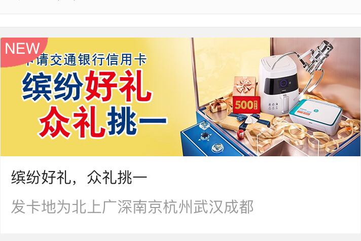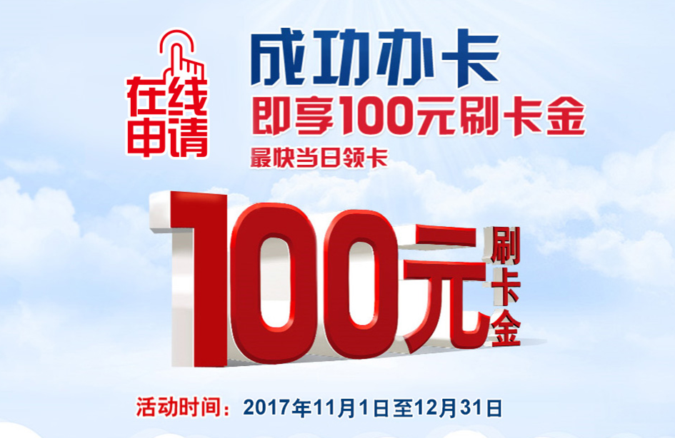 1.网络办卡渠道:即日起至2017年12月31日新客户办理交通银行信用卡,即可享受100元刷卡金返还。赶快行动吧,网络办卡三天拿卡,持本人有效身份证前往任意交通银行网点激活可用!