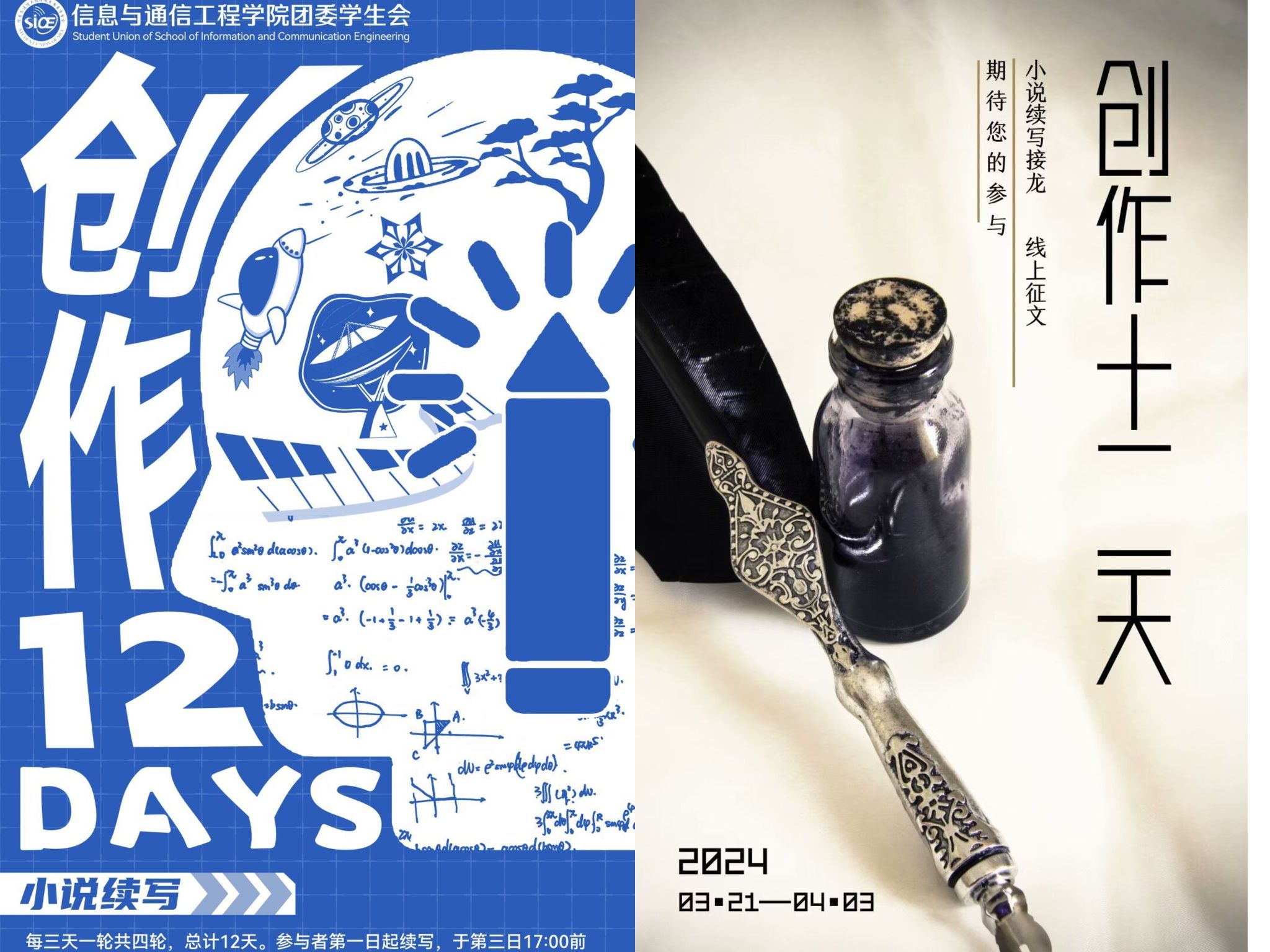 3月21日至4月5日,信息与通信工程学院团委学生会青年建设中心和实践部联合组织了一场妙趣横生的文学盛宴——“创作十二天”接力续写活动,不仅为参赛者提供了一个展现创意的舞台,更为同学们带来了一场无与伦比的灵感盛宴。在“创作十二天”活动中,参赛者们接力续写,通过四位不同的作者,四种迥异的风格,四类独特的创意,将故事的起承转合演绎得淋漓尽致。这一开放而有趣的创作模式,不仅展示了大家的文学素养,更激发了大家...