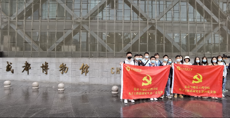 为庆祝建党一百周年,深入学习习近平新时代中国特色社会主义思想,结合地域特色、回顾党的光辉历程,着眼学生身份、弘扬党的优良传统,激励研究生党员不忘初心、牢记使命,2021年4月17日,电子工程系研究生第二、四党支部联合数学科学学院研究生第三党支部于成都市博物馆开展“忆百年峥嵘党史,与伟大信仰对话”主题党日活动。