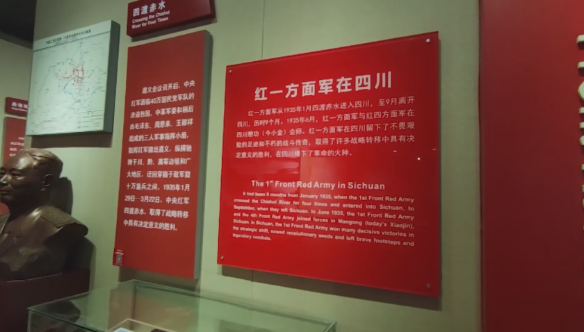川渝四队的队员们来到了建川博物馆,首先参观了长征部分的突出重围部分。讲解了长征的原因,展示了工农起义的革命形势图和红军军旗。毛泽东主席和朱德的图像高挂墙上,并为我们展示了当时的枪械和碉堡的样子。接着来到了第二单元红一方面军在四川的历史故事,并为我们讲解了四渡赤水的故事和巧渡金沙江的历史故事。将所展示的历史资料都进行了大致讲解。