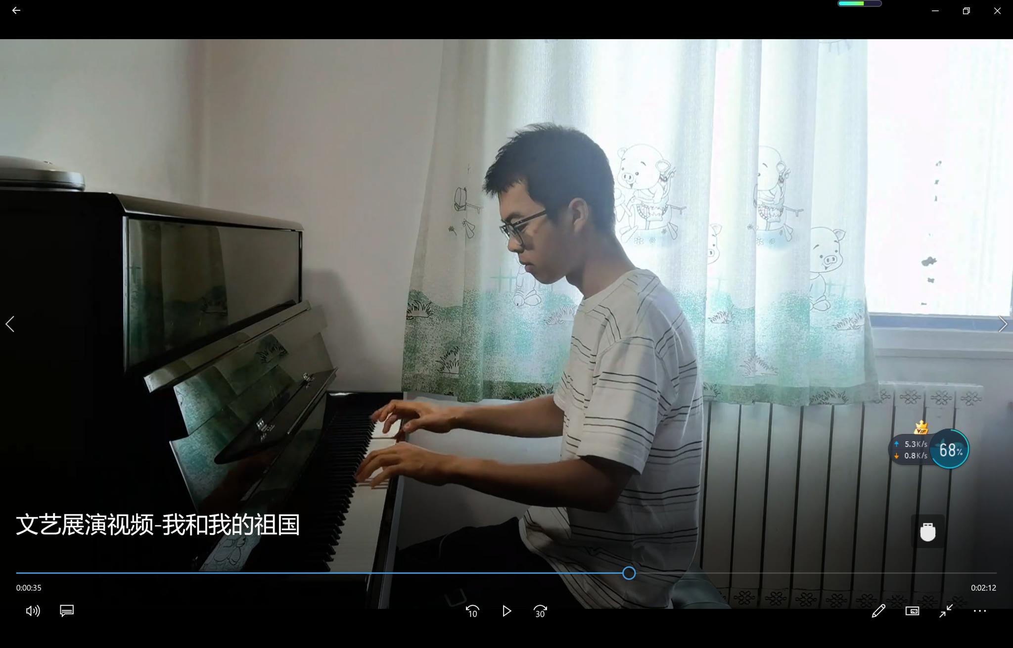 温欣和郑与时同学分别用小提琴和钢琴演奏爱国主义歌曲《我和我的祖国》,用音乐表达对伟大祖国的衷心依恋和真诚歌颂。