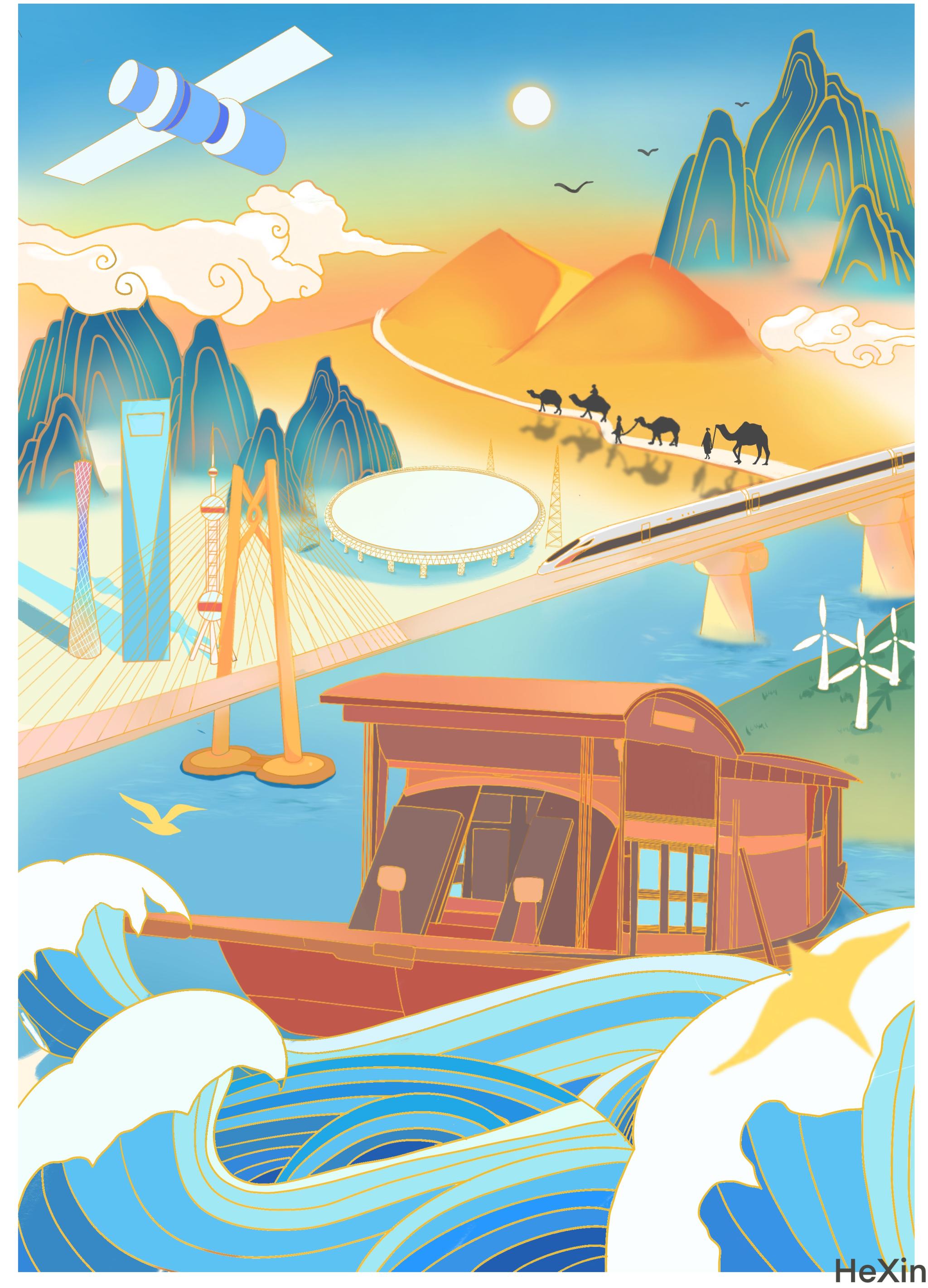 和欣同学以“红船”为出发点进行绘画创作,寓意中国革命的航船在此启航,在时代浪潮中破浪前行驶向光辉彼岸。以此鼓励广大青年勇担新时代赋予的新使命,为祖国建设添砖加瓦。