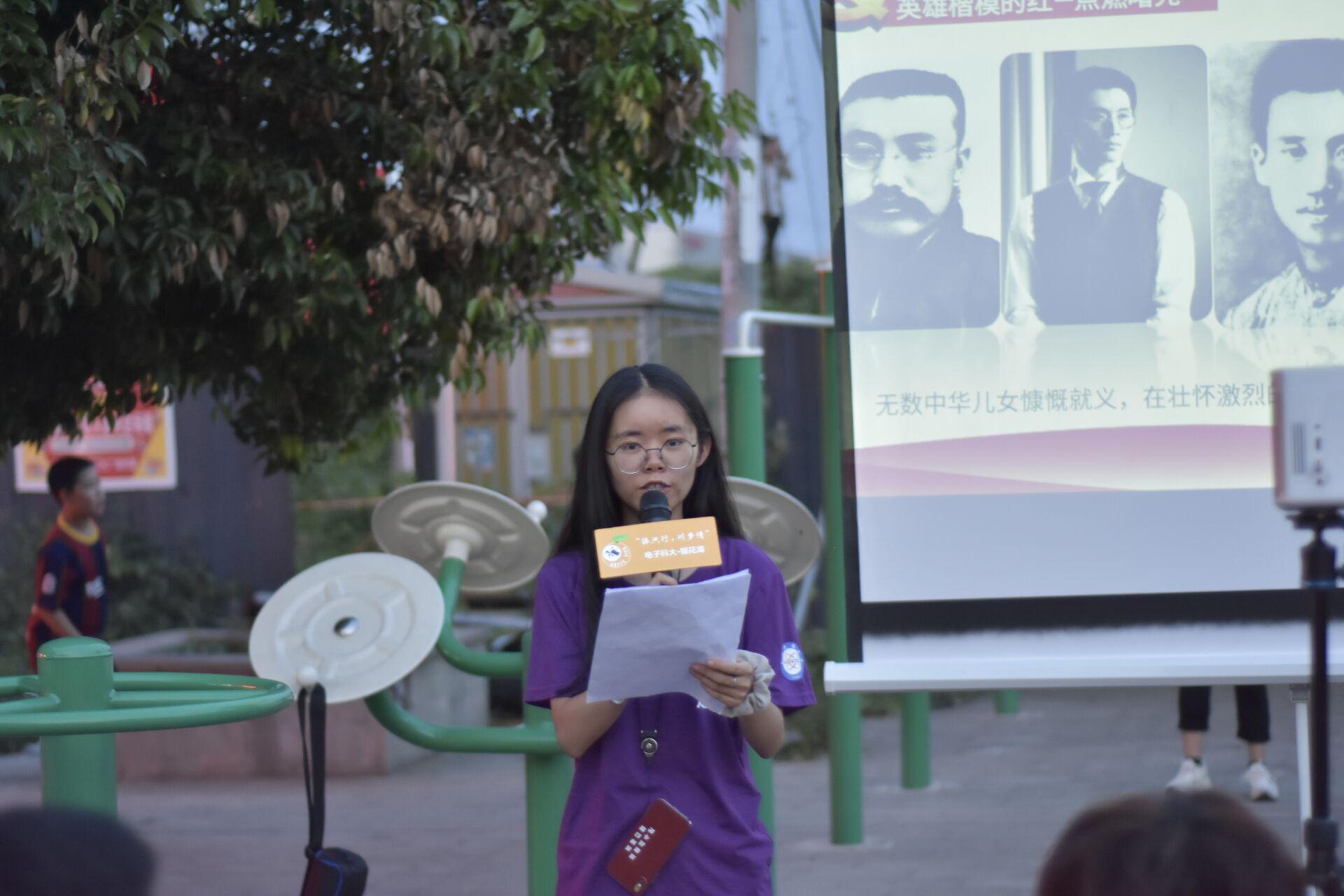 7月8日,张文颖同学来到四川省绵阳市银花湖村,为村民们带来题为《中国共产党人的精神》的微党课,讲述百年前共产党员舍生忘死救中国和百年后成电师生党员响应号召助力脱贫攻坚的感人事迹。宣讲结束后,为村民们播放电影《建党伟业》,让党史学习“活起来”。