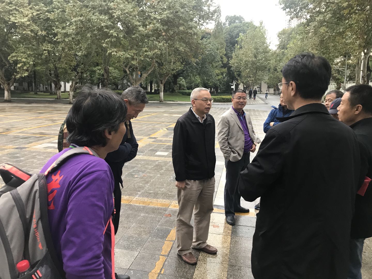 15:00,校友一行来到沙河校区,因就读时期在沙河,成电情怀更多也在沙河。以主楼为中心进行汇合,并合影留下珍贵镜头。接着来到逸夫楼门前,班级认养的银杏树下。距上一次入学30周年聚会,时隔4年再回,认养的小树已经长高许多,尤其银杏果挂满枝头,大家更觉开心。