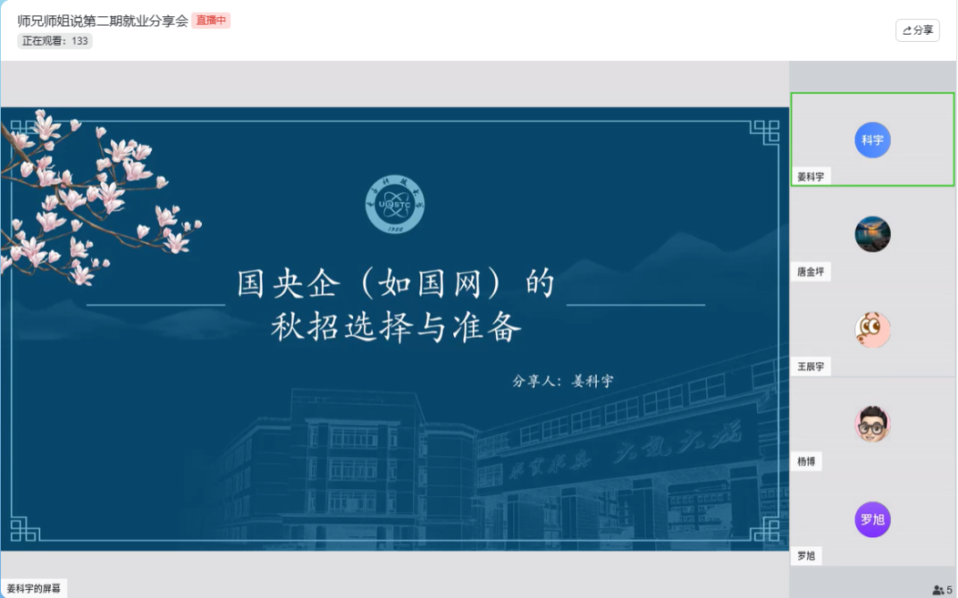 2023年4月10日晚,信息与通信工程学院研究生职业发展中心联合电子工程系研究生第四党支部在线上成功举办“师兄师姐说”第二期求职经验分享活动。此次活动邀请到签约国家电网、天翼云、中兴通讯、蚂蚁蓉信和中电科30所的五位应届毕业生,吸引近300名学生参与。