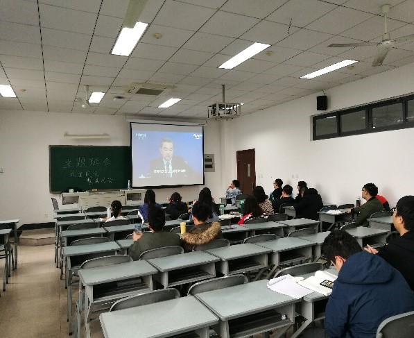 最后,同学们一起观看了外交部长王毅在两会上的答记者问的视频。通过记者的提问与王毅部长的回答,同学们看到了国际社会对一带一路建设的质疑与肯定、一带一路伟大构想的正确性以及党和政府对实现中华民族伟大复兴的决心与信心!