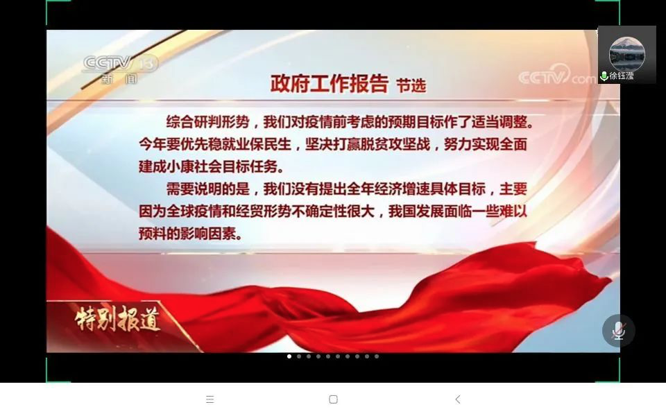 公共管理学院本科学生第一党支部组织学生党员通过腾讯会议收看了十三届全国人大三次会议开幕式直播,引导支部党员积极关注“两会”热点,思考“两会”观点,学习“两会”精神,同时把会议精神与平时的学习、工作相结合,努力为实现祖国的宏伟蓝图而奋斗!