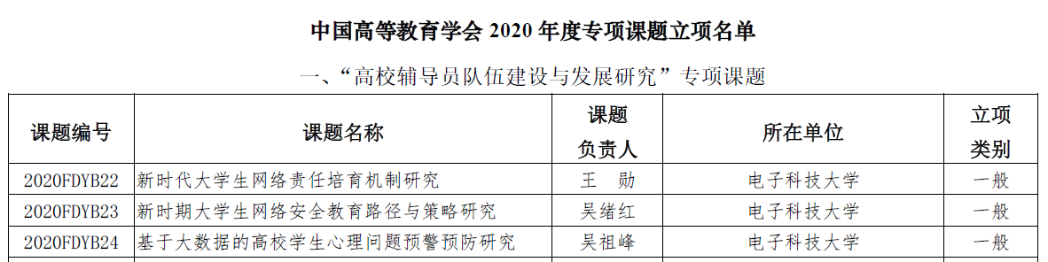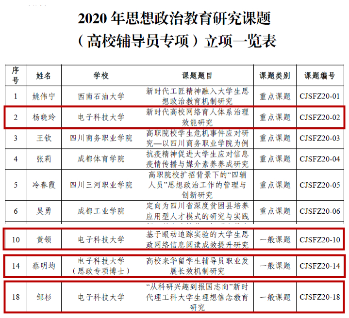 近日,四川省教育厅、中国高等教育学会分别公布2020年思想政治教育研究课题(高校辅导员专项)和2020年度专项课题(高校辅导员队伍建设与发展研究专项)立项结果,电子科技大学共7项课题入选。