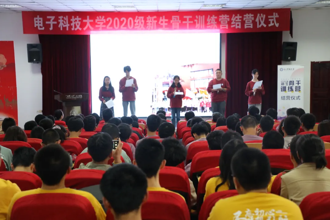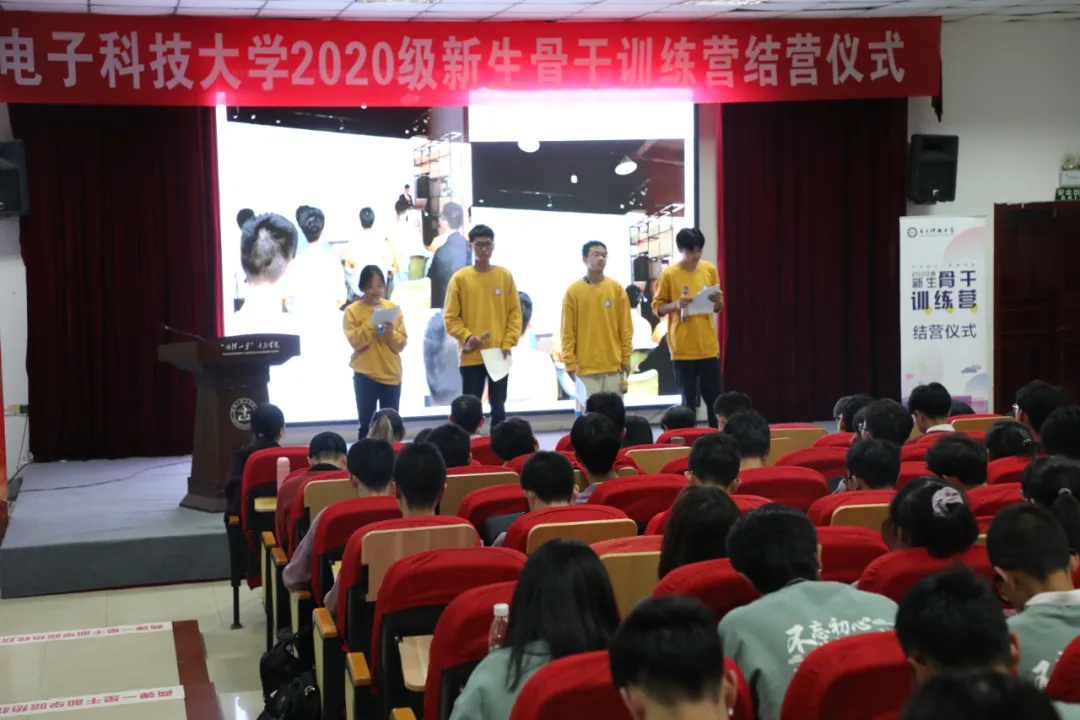 结营仪式上,各班同学都用自己的方式总结了在新生骨干训练营的成长。一班的同学朗诵了原创诗歌《给电子科技大学的一封情书》,深情回顾了在训练营的点点滴滴与难忘回忆;二班同学用视频回顾的方式,展示在训练营期间培养的活跃向上的班级氛围,总结了在新生骨干训练营收获的欢乐、友谊、动力;三班四位学生代表分别从学、思、悟、践四个方面展开总结,“阅读四史使大家增强了理论认同、聆听讲座让大家思想提升,导师和导生让大家切身感受到了什么是榜样引领”;四班在结营仪式的舞台上组织了一场别开生面的“班级成长报告会”,八位同学分别回忆了自己在新生骨干训练营的难忘瞬间。班主任代表郝一桦回顾了二班同学的成长,肯定了同学们从思想上到行动上的进步。