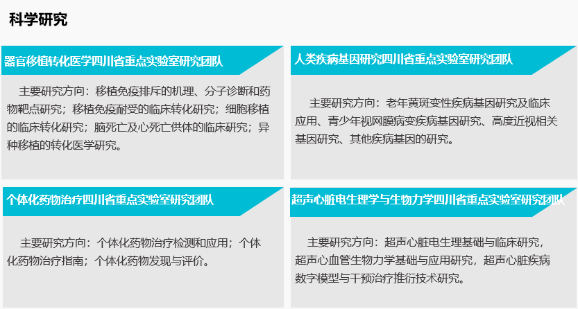 医学院现有专任教师439人,其中在校专任教师17人,高级职称教师占比70.6%;附属医院双聘教师422人,高级职称教师占比76.5%。学院拥有临床医学和护理学学士学位授权点,临床医学、护理学、药学、口腔医学、生物学硕士学位授权点,生物医学工程博士学位授权点。学院设有基础医学部和临床医学部(院),建有基础医学教学中心、基础医学实验中心、临床技能培训中心,拥有5个省级重点实验室和多个高水平医学研究团队。近五年,学院及附属医院承担了国家重点研发计划3项,荣获国家科技进步二等奖1项,四川省科技进步一等奖、二等奖各1项,省医学科技奖一等奖2项等科研奖励,获得专利授权100余项。